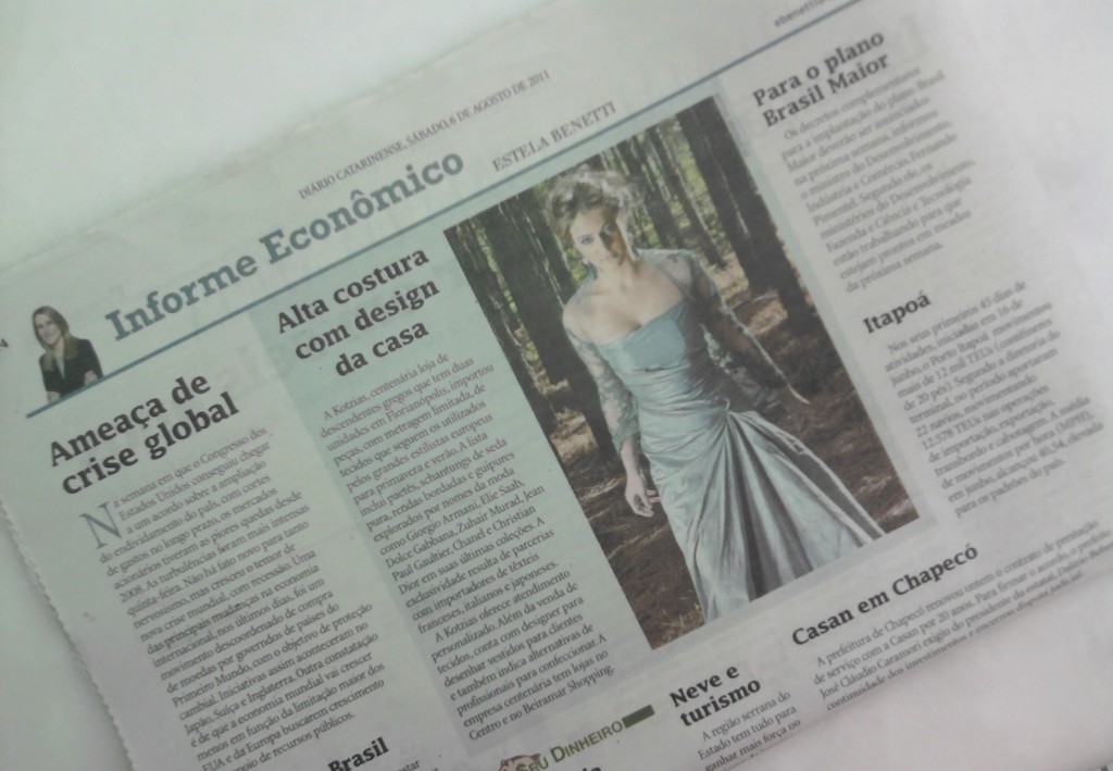 A Kotzias Tecidos foi destaque na coluna Informe Econômico redigida pela jornalista Estela Benetti publicado no dia 06.08 no jornal Diário Catarinense. Com o olhar voltado aos fatos e cenários econômicos, Estela Benetti elogia as boas parcerias da empresa e seu alinhamento com as grandes marcas do setor. Tudo isso emoldurado por uma linda peça publicitária da nossa mais recente coleção. Você pode conferir abaixo a nota na íntegra: